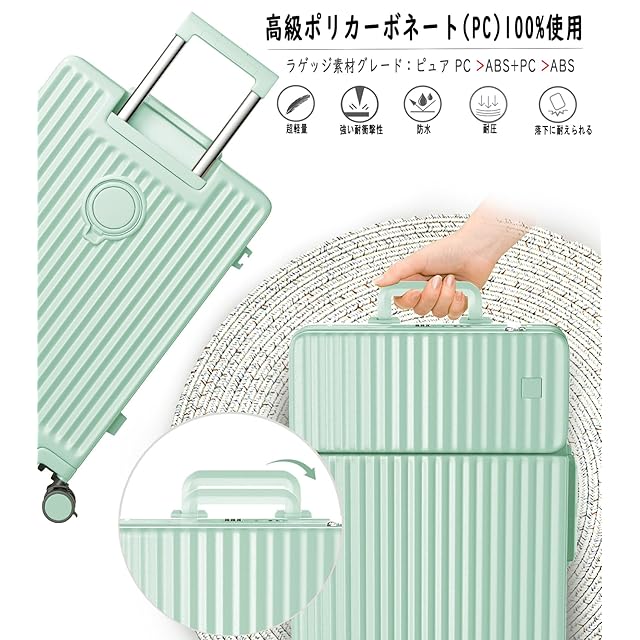 「丈夫かつ軽いPC素材、世界標準のTSAロック」 表面素材は高耐衝撃性を持つPC(ポリカーボネート)を100%使用。高弾性で、変形しにくい。ABS素材を採用した市販品より頑丈で耐久性に優れ、ABS+PCスーツケースより軽量で持ち運びやすい。PC 素材は、現在市場で最も一般的に使用され人気のあるハードシェル ラゲッジであり、防水性、耐摩耗性、スタイリッシュさ、耐衝撃性、落下耐性を備えています。弊社のスーツケースには世界標準のTSAロックが装着されており、ロックしたまま荷物を預けることができ、税関を早めに通ります。 ※鍵は航空会社検査専用のため本製品には付属しておりません。