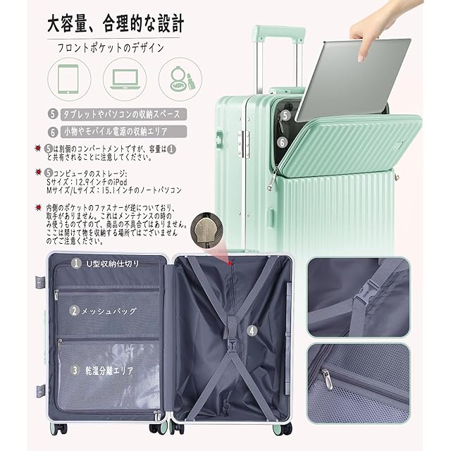 「サイズ」Sサイズの外寸は54.5*35*23cm、重さ:3.96kg 超軽容量、は42リットル、1~3泊に似合います。Sサイズは一部の航空会社だけに適用しますので、事前に航空会社に確認したほうがいいんです。Mサイズの外寸は60*43*26cm、重さ:4.87kg 、容量は65リットル、4~7泊以上。Lサイズの外寸は73*48*30cm、重さ:6.05kg、 容量は97リットル、7泊以上