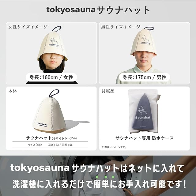 断熱性・耐久性 - 高い断熱性により、のぼせを防ぎながら、息がしやすく快適にサウナ室でお過ごしいただけます。 また、円錐形状が熱を頭部にこもらせず、頭部のベタつきを軽減し、快適な着用感を実現しています。長期間の使用にも耐える生地と、tokyosauna 独自の縫製により、高い耐久性を実現。洗濯や日常的な使用にも強く、長くご愛用いただけます。
