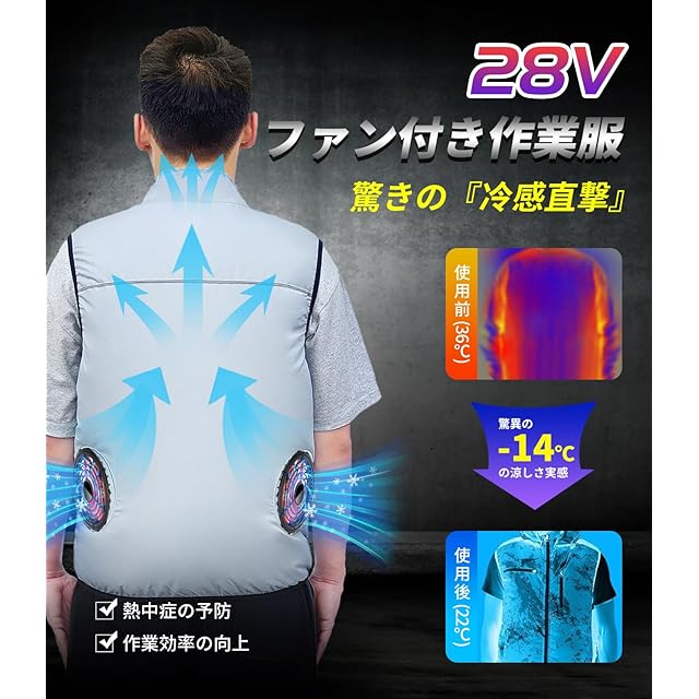 【28Vファン付き作業服&セット内容】2025夏の最新作、28V空調作業服 ファンバッテリーフルセットが新登場!左右の腰の辺りに取り付け2個のファンにより、空気を服の中に取り込み、汗の気化を促進し、体温と湿度を快適なレベルまで調整し、清涼感に溢れている 2025最新モデル KLIFEファン付きベストです。真夏のべたつく汗、焼けつくような日差し対策として活躍します。作業時の動作を快適に保つベストタイプ!裏メッシュ仕様と裏ポケットで、配線などはしっかり収納して、直接肌に触れることがなく、作業に支障がないです。ポリエステル100%生地を採用し、速乾性と通気性に優れている ます。襟のジッパーを開けて、アイスバーに入れて、涼しさを2倍にすることができます。「セット内容」ベストx1、ファンx2、モバイルバッテリ—x1、接続ケーブルx1、バッテリー用充電アダプターx1、日本語取扱説明書x1。