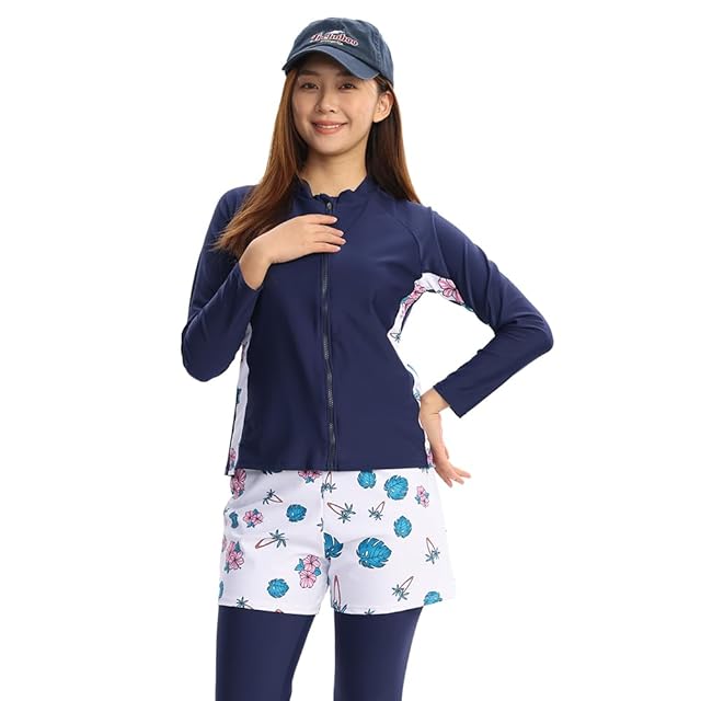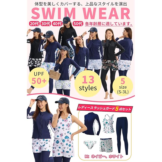 [Wotivon] 水着 レディース 体形カバー 5点セット ラッシュガード フィットネス水着 UPF50+ UVカット率 99.4% (S, M:ネイビー、ホワイト)