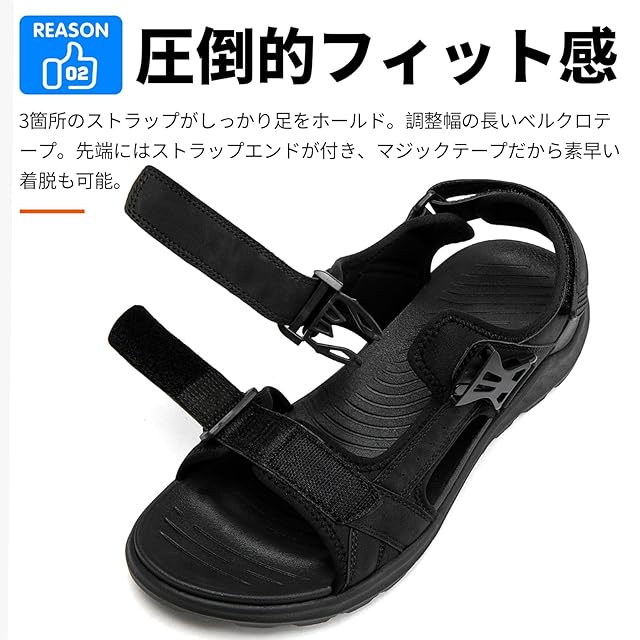 1.面ファスナーストラップで微調整!ぴったりサイズにホールド!足幅部分と足首部分が面ファスナーで調整できるので、自分好みのぴったり快適な履き心地に。【おすすめポイント】夏の定番 脱ぎ履ぎが簡単なスポーツサンダル。