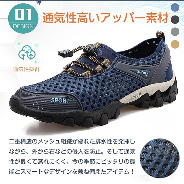 【優れる速乾性と排水性】靴底は穴を付いているため、水が通じやすいデザイン!インソールにも穴が付き、通気性や排水性さらにアップします。靴は速乾性の特徴が持つので、決して重く感じません。