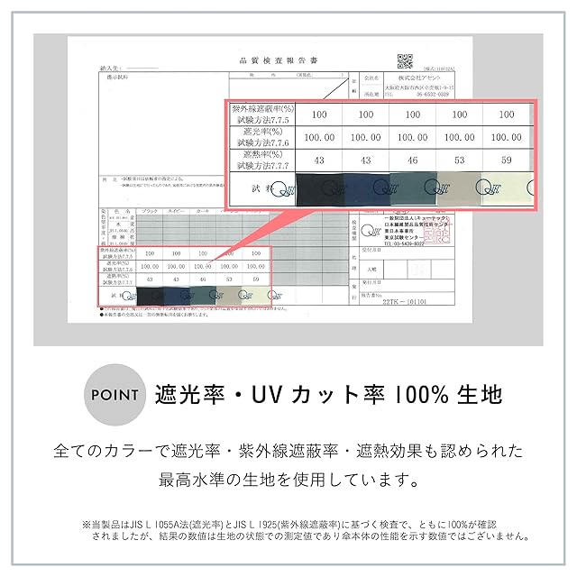 (※)当製品はJIS L 1055A法(遮光率)とJIS L 1925(紫外線遮蔽率)に基づく検査で、ともに100%が確認されましたが、結果の数値は生地の状態での測定値であり傘本体の性能を示す数値ではございません。また、商品生産時期により付属品等への記載が「99%」等の表記の場合がございます。その場合でも検査上「100%」を確認した商品ですので、予めご了承くださいませ。