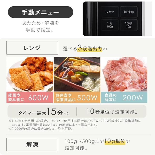 【操作】ワンタッチあたため:飲み物、ごはん、自動調理の3つから用途に合わせてタッチ!①【自動調理】チャーハン、スープご飯、パスタ、鶏ハム、肉じゃがなど5種類の料理がワンタッチで調理可能なので、忙しい時に便利な機能です。②【手動調理】600W:総菜や飲み物、500W:お弁当や冷凍食品、200W:食品の解凍!タイマー最大15分、10秒単位で設定可能です。③【解凍】100g~500gまで10g単位で設定OK