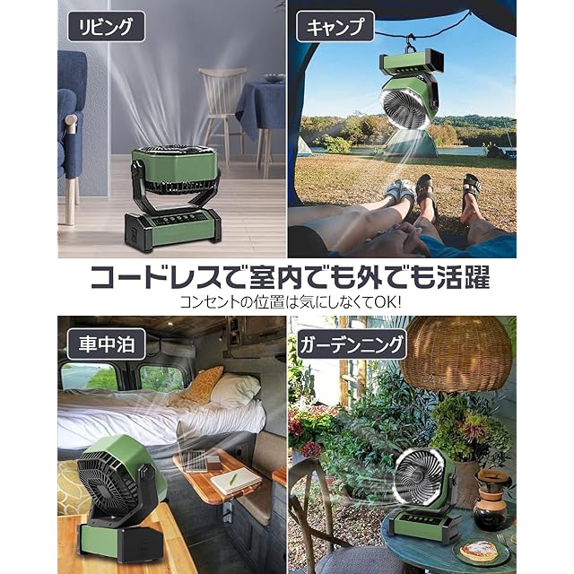 【自動首振り&20000mAh】 扇風機 キャンプ アウトドア 充電式ファン 充電式扇風機 コードレス リモコン付き 切タイマー ポータブル 小型 屋外 サーキュレーター 二重反転ファン 風力4段階 LEDライト 吊り下げ 強力送風 暑さ対策 アウトドア用 災害対策 グリーン
