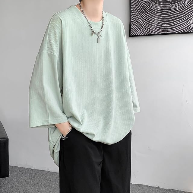 [Fasshonrida] 七分袖 メンズ tシャツ おしゃれ 縦縞ジャガード 半袖 ティーシャツ 涼しい 夏服 人気 無地 ロンt 大きいサイズ てぃーしゃつ しちぶ袖 トップス かっこいい 服 オシャレ ストライプ柄 tshirt 春 夏 green M