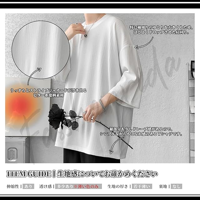 表面の凸凹でストライプ模様のような縦縞をジャガード織りで表現したのクルーネック七分袖Tシャツ。さりげないシャレ感が生まれ、上品さのある雰囲気にしてくれますよ!!着心地も、伸縮性抜群で言うことなし。ドライタッチでシャリ感のあるしっかりした風合いもポイント。