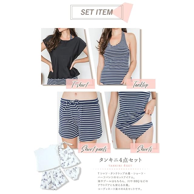 ✅【 充実の4点セット 】オーバーTシャツ、タンキニ上下、フレアパンツの体型カバー水着4点セット。 ✅【普段着感覚で着用OK!】全てを着用すればまるで洋服のようなデザイン!おしゃれに体の気になる部分を隠してくれるので夏のマストアイテム間違いなし!アクティブな動きにも対応しているので、マリンスポーツや海のレジャーで大活躍する水着セットです。