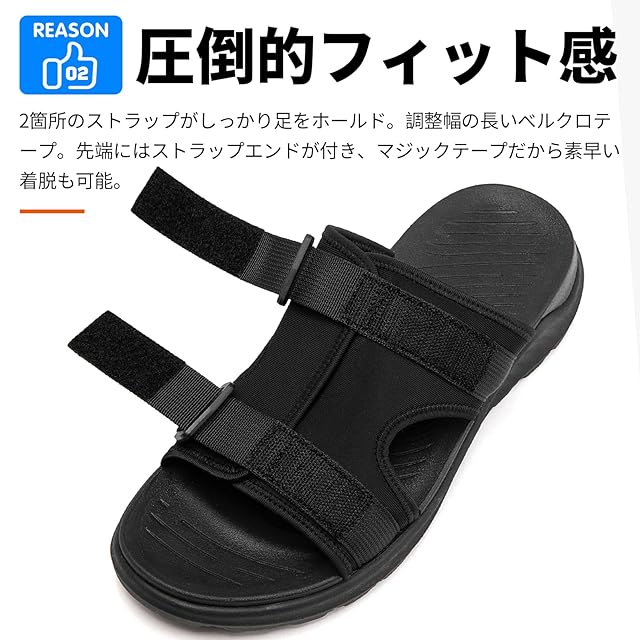 1.面ファスナーストラップで微調整!ぴったりサイズにホールド!足幅部分と足首部分が面ファスナーで調整できるので、自分好みのぴったり快適な履き心地に。【おすすめポイント】夏の定番 脱ぎ履ぎが簡単なスポーツサンダル。