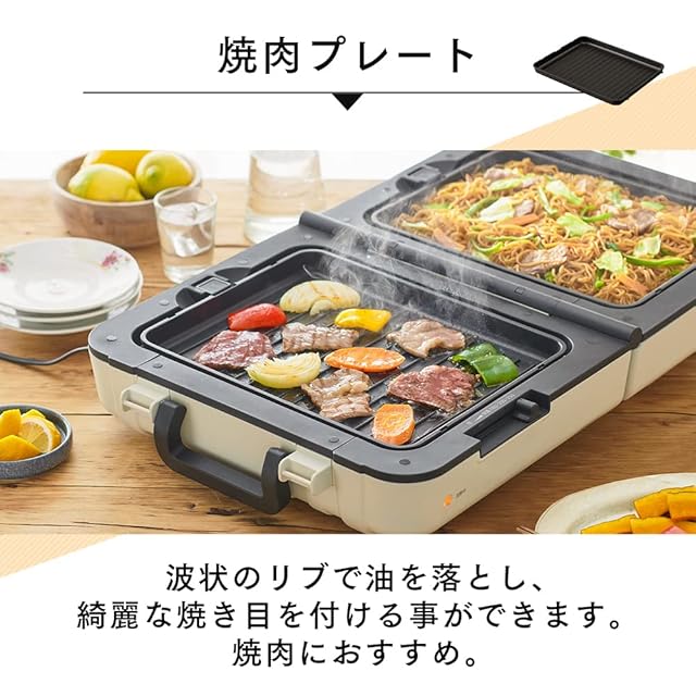 ◆ワイドサイズのプレートで2つの料理を同時に左右別々で温度調節が可能なので、適切な火力で2品同時に調理できます。また調理と保温を分けることで、作った料理を最後まで暖かいまま美味しく食べられます。◆3種類のプレートで楽しさ広がる!!平面プレート定番のお好み焼きはもちろん、パンケーキなどのデザートを作るのもおすすめです。たこ焼きプレートアヒージョやケーキポップ等、様々なアレンジ料理が楽しめます。さらに、焼肉プレート波状のリブで肉の油を落とし、きれいな焼き目をつけることができます。◆ふた付きで料理の幅が広がる付属のふたを使えば、蒸し料理も可能なので、焼き物だけでなく幅広い料理が楽しめます。
