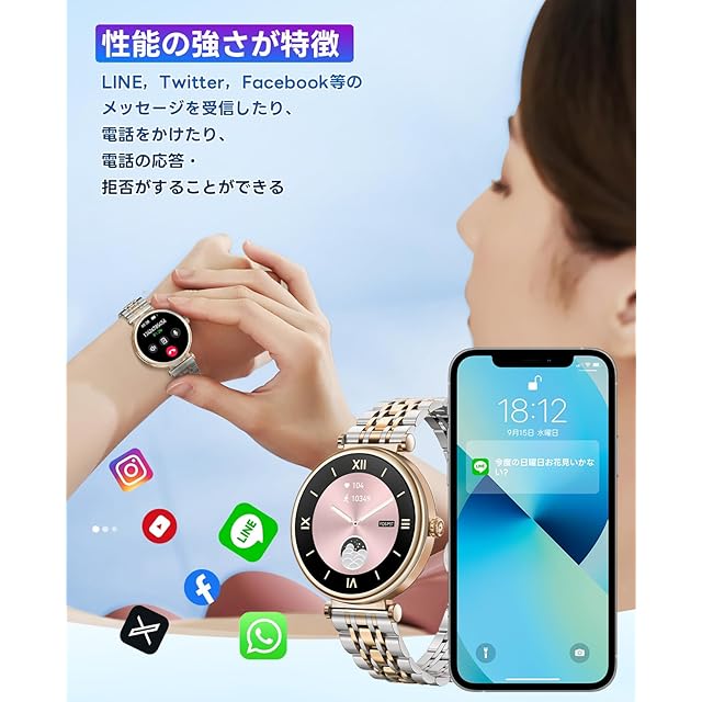 【Bluetooth通話機能付き&着信通知】この女性用 スマートウォッチは 最新の5.3Bluetooth技術を搭載し、スマートフォンと簡単にペアリング可能です。これにより、着信、メッセージ、SNS通知(LINE、Twitter、Instagramなど)の通知をリアルタイムで受け取ることができます。重要なメッセージを見逃すことなく、常に最新通知を手元で確認できるので、忙しい日常でも安心です。エレガントなデザインと高度なテクノロジーが融合したこのスマートウォッチで、日常生活をより便利でスタイリッシュに演出しませんか?