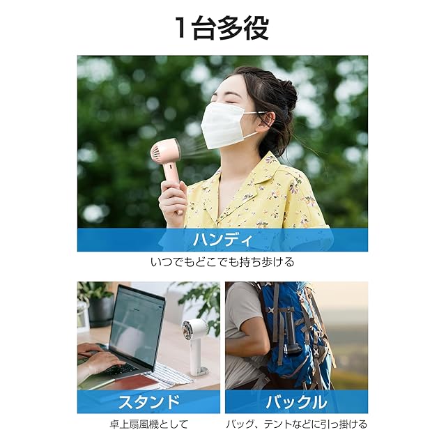 【嬉しい3色展開&1台多役】ホワイト・ピンク・ブラックの3色展開です。お好みや用途に合わせて色を選ぶことができますし、贈り物としての選択肢もありでしょう。また、小型ながら多様な使い方が可能。手持ちの扇風機として使うこともできますし、スタンドとしてテーブルに置いて使うこともできます。さらに、バックルついているのでテントやバッグに引っ掛けることもできます。