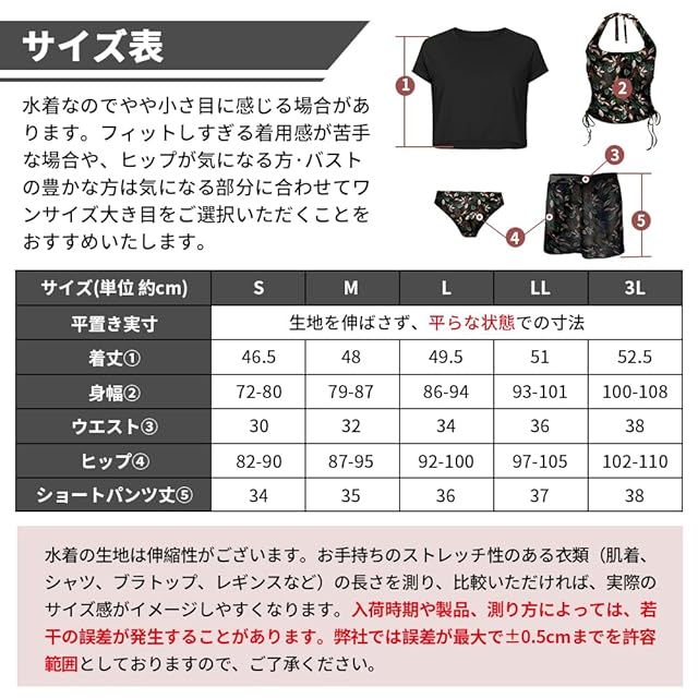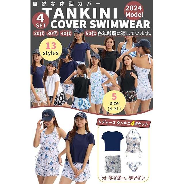 【適用対象】体型カバーが楽ちんなタンキニ4点セット、水着経験が少ない方や露出を控えたい方に最適、3WAYで着こなせて、ティーンからママまで幅広く使えるアイテム。
