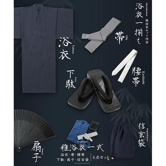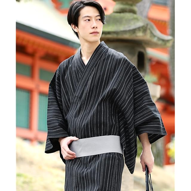 [ロシェル] メンズ 浴衣 6点セット (浴衣 帯 下駄 信玄袋 扇子 腰帯) L E 夜雨|ワンタッチ帯 簡単着付け 浴衣セット 夏服 祭り 花火 ゆかた 涼しい シンプル 無地 和服 和装 紳士
