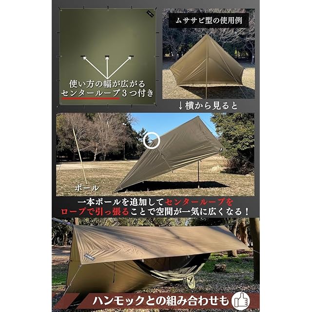 【変幻自在なスクエアタープ】 ループ19箇所&ハトメ8箇所付き、ポールやロープを組み合わせ、天候やシーンに合わせて簡単に自分好みにアレンジできます。また、3つセンターループによって張り方のバリエーションが更に増える。パップテントや避難所としてもご利用できます。
