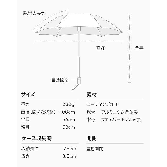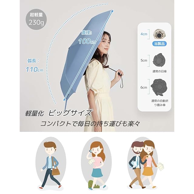【コンパクト、超軽量、ビッグサイズ、頑丈】konciwaの折りたたみ傘は、最先端の軽量で丈夫なグラスファイバーとアルミ合金の骨組みを採用し、軽量性、コンパクトさ、頑丈さを実現! 開いた状態の直径は100cm、収納時の厚さは僅か3.5cm、超薄型でポケットに収納できる超コンパクト設計! さらに、約230gの重さは非常に軽く、毎日の持ち運びに最適! 通勤・通学、旅行、ハイキング、スポーツなど、あらゆるシーンで幅広く利用でき、老若男女問わず幅広い世代の方々にご利用いただけます!
