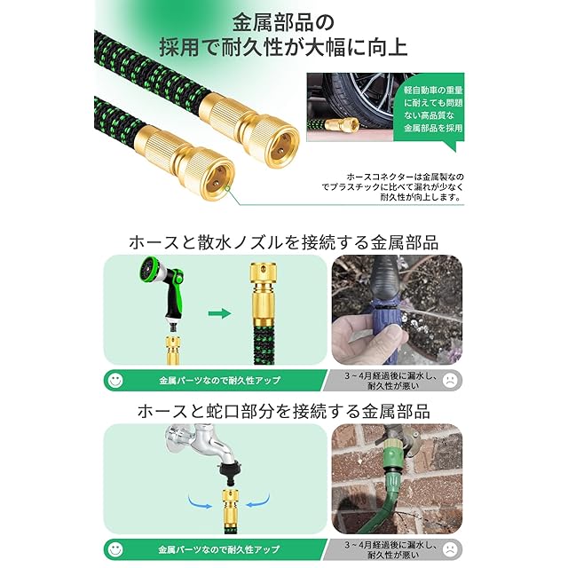 【改良された金属部品&優れた耐久性】 Yofidra ホースは部品がプラスチックコネクタから金属コネクタに改良しました。 金属部品の採用により、散水ホースの耐久性が大幅に向上。うっかり落としてコネクタを破損する心配がなく、いつでも安心して使用できる。また、金属部品を使用しているにも関わらず非常に軽い散水ホースです。2.5~7.5mのサイズはわずか0.97kg、5~15mのサイズはわずか1.38kg、7.5~22.5mのサイズはわずか1.82kg、10~30mのサイズはわずか2.3kgです。市販のビニール ホースに比べて40%軽く、お年寄りや子供でも使いやすい。 耐久性と軽量性を兼ね備えたホースです。