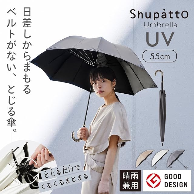 【きれいに畳む手間のない日傘/16本骨】ベルトがなく、とじるだけで、生地がまとまるShupatto アンブレラから、日傘が登場。折りたたみ傘特有の、生地を丁寧に畳んでボタンを留める作業がないので、建物や日陰の出入りもスムーズにできます。