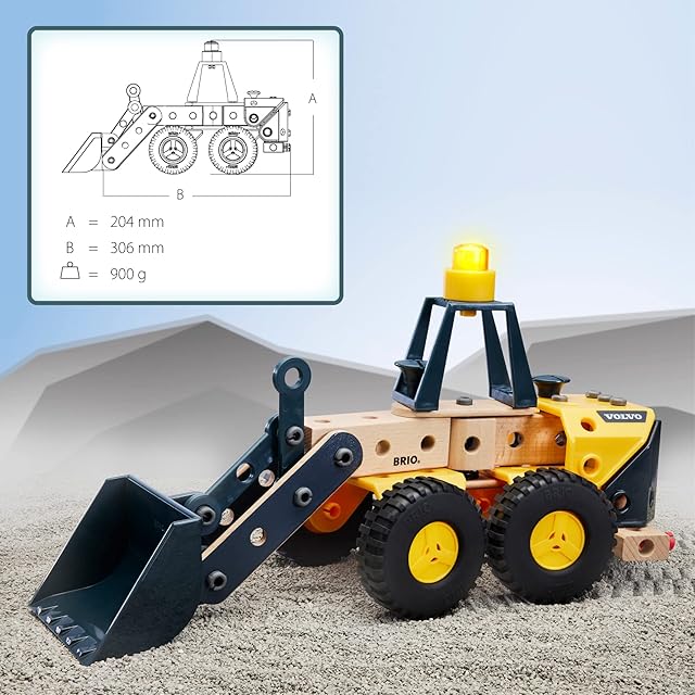 ダンプバケットやバッテリー警告灯などのリアルな遊び機能を搭載した組立おもちゃ BRIO ビルダーの 34598 Volvo ホイールローダーで、荷物を持ち上げましょう。