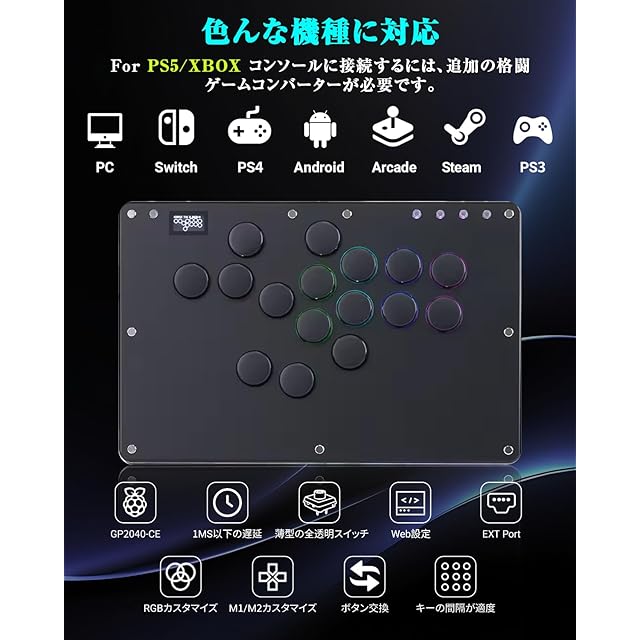 【対応機種】 基盤/システムは低遅延のRaspberry pi pico GP2040-CEを搭載、ファームウェアのアップデートにも対応可能。対応機種:Windows 10以降/ Steam Deck/PS3/PS4/Switch/Raspberry Pi(Lakka、RetroPie、Recalbox、Batocera)/MiSTer/Android、Linux、iPadOS、macOS. PS5とXBOX本体接続に接続する際は、互換性を確保するため、追加の専用コンバーターが必要です。