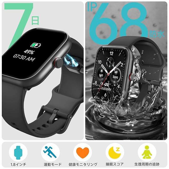 【100種運動モード・IP68防水】:このスマートウォッチには、登山やランニングなど、100種類以上のスポーツモードが搭載されており、さまざまなスポーツやフィットネスのワークアウト時間をトラッキングします。また、毎日の歩数を記録する活動量計としても利用でき、運動への意欲を高め、運動不足の解消をスマートにサポートします。IP68の防水性能を備えており、手洗いや顔洗い、プールでの泳ぎにも対応しています。ただし、海水中やお風呂、サウナ、温泉の水や湯気、高水圧の高温環境では使用しないでください。