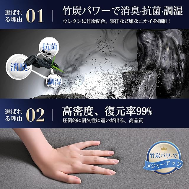 【商品情報】サイズ:120x195x5cm(セミダブル)。製品重量:5.1kg。ウレタン:厚さ4.5cmの高反発ウレタンフォーム。通気性に優れ、ムレにくい抗菌仕様洗えるカバー付きベッドマット。表地ポリエステル、裏面は滑りにくいノンスリップ仕様。マットレスを使うと、安心して極上の寝心地を手に入れられます。対策は施しておりますが、どうしても新品ウレタン素材特有のにおいが気になる場合、風通しの良い場所で陰干ししてからご使用ください。数日から1週間ほどで、気にならない程度まで改善されます。また、このにおいは無害ですので、ご安心ください。