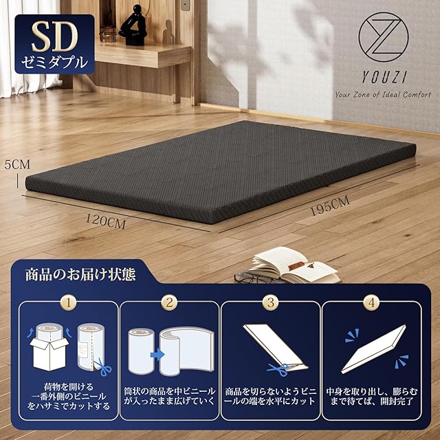 YOUZI マットレス セミダブル 高反発 敷布団 ブラック 厚さ5cm 硬さ180N 高密度 ベッドマットレス 洗えるカバー付き 腰サポート 抗菌防臭 圧縮梱包 寝返りしやすい 120x195x5cm