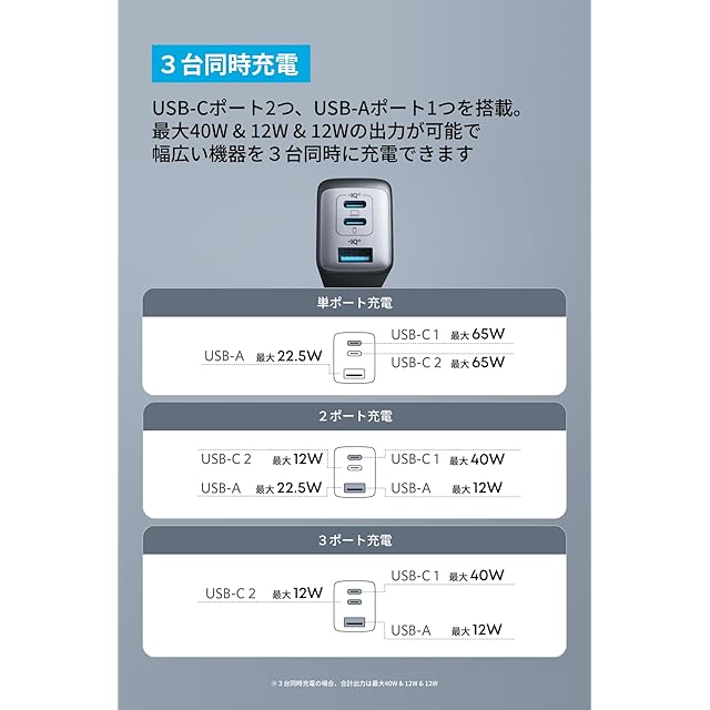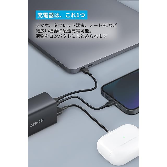 3台同時に充電可能:スマートフォン、タブレット、MacBook、USB PD対応のWindowsノートPCなど、多種多様なデバイスを一度に充電可能。PowerIQ 3.0 (Gen 2) を 搭載した2つのUSB-CポーとAnker独自技術PowerIQ搭載のUSB-Aポートを備えています。3ポート利用時の合計最大出力は65Wと高出力。機器毎に異なる充電器を持ち運ぶ必要はありません。※3ポート利用時の合計最大出力は64W