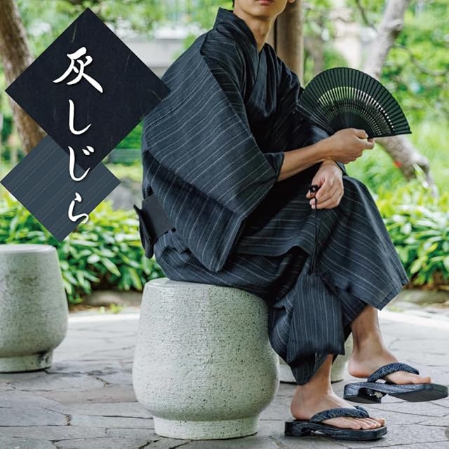【 商品の仕様について 】メンズ浴衣セット(浴衣・帯・内帯・巾着・扇子・下駄) 浴衣:綿100%、帯:ポリエステル100%、内帯:ポリエステル100%。カラーは黒しじら、紺しじら、濃紺しじら、灰しじら、夜雨の5種類。サイズはS・M・Lサイズをご用意。お好きなカラーと帯で夏をお楽しみください。 夜雨のみ平織となっております。