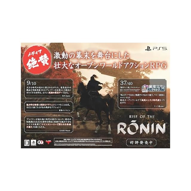 ■シンプルで奥深い戦闘で敵に立ち向かえ。 ■混沌の幕末時代、美しい日本を自由に冒険しよう。 ■あなたの決断で変化し、進展する物語を作り上げよう 型番:ECJS-00031 (C) 2023 コーエーテクモゲームス. Rise of the Ronin is a trademark of KOEI TECMO GAMES CO., LTD. Published by Sony Interactive Entertainment Inc.