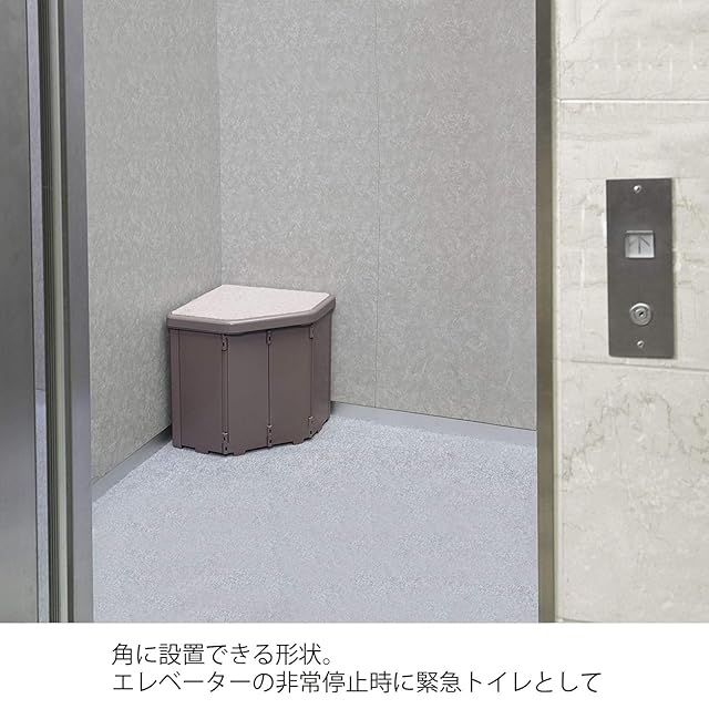 普段は腰掛け、非常時はトイレになる簡易トイレです。コーナー部分に設置できる仕様です。
