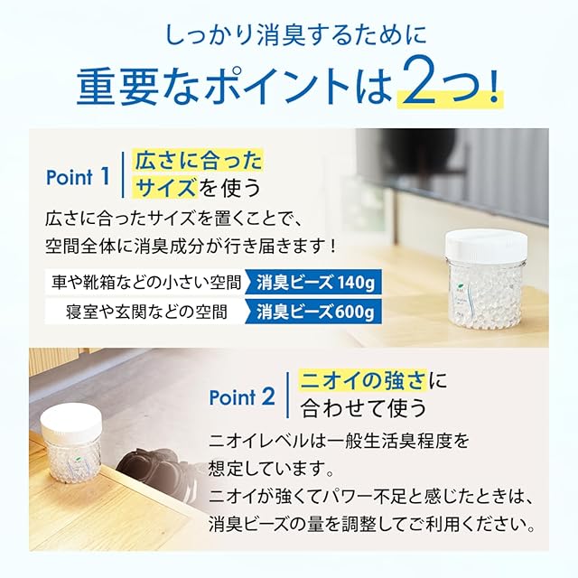 【消臭に大事な2つのポイント】 ●ポイント1:”広さに合った”サイズを使うことで、空間全体に消臭成分が行き届きます。 ●ポイント2:”ニオイの強さ”に合わせて使うことが重要です。ニオイが強くパワー不足と感じた時は、消臭ビーズの量を調整してご利用下さい。