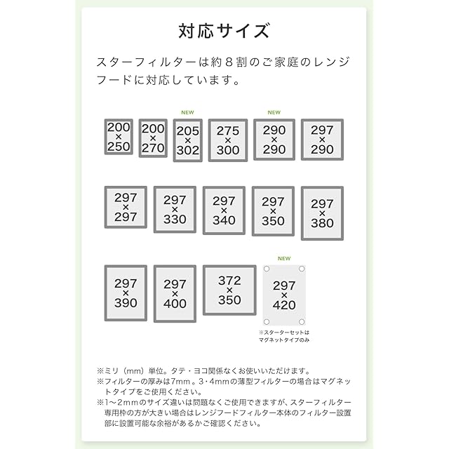 ●297×290mm枠用:タカラスタンダード VU-603/901/902/903、 VUS-603/604/605/903/904/905●297×340mm枠用:F341、F347、A341H1AA、BDRシリーズ、BDRLシリーズ●297×350mm枠用:VNS-902/903/904/905、SVNS-902/903/904/905、VMH-601/901、VMR-905/906●297×400mm枠用:F401、SBAR-901/902、SBARF-901/902、SBARL-901/902●372×350mm枠用:VMH-752/753、VMR-754/755/756●マグネットタイプ:フィルターレスタイプ、ノンフィルター、よごれんフード、ほっとくリーンフード、とってもクリンフード、キレイツモフード、イージーフィルタ