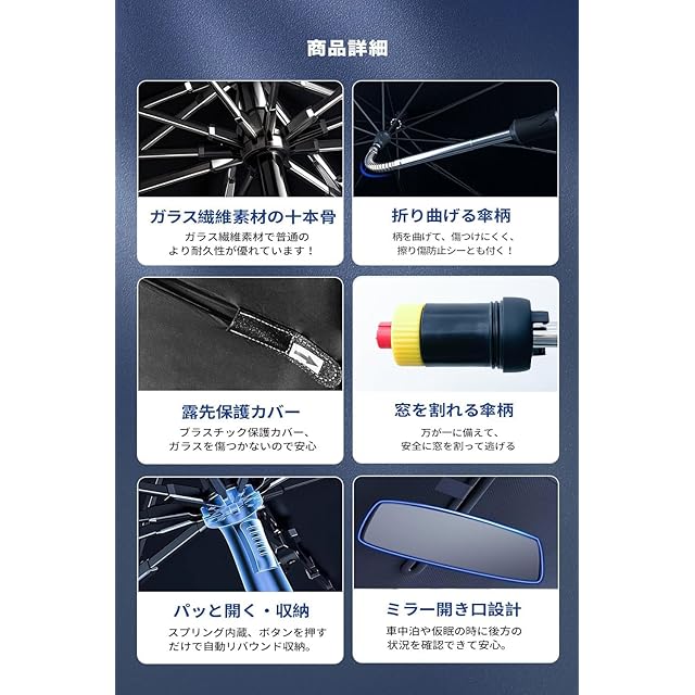 【緊急脱出ハンマー機能付き】ワンタッチで広がる便利さに加え、独自設計のハンドルを採用。ハンドル部分は、万が一の事故や災害時に緊急脱出ハンマーとして使用可能。窓ガラスを素早く割って脱出できるため、いざという時に命を守る頼れる一本です。