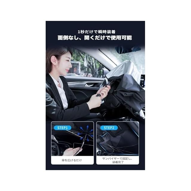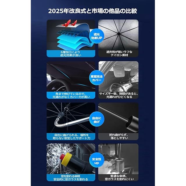 【高品質材料】2025年最新版傘型車用サンシェード、伝統的なサンシェードとは異なり、本製品は骨組みに工夫を凝って頑丈な黒鋼骨製の十本の傘骨を採用して優れた耐用性を持っています。耐摩耗性、耐老化性、耐衝撃性が優れている。