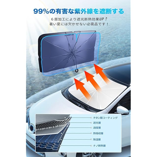 【猛暑対策99.5%以上UVカット・遮光断熱】夏には、紫外線を防ぎ、車内の温度を下げることを目指します。フロントサンシェードにより、紫外線に対するバリアを作ります。約98%以上の紫外線を効果的に遮断しますので、外気温が上昇しても、駐車中の車内を涼しく保ち、ひどい暑さを防げます。蒸し暑い車の環境に悩まされることはなくなります。内装劣化防止、ダメージや経年劣化を防ぎます。駐車時の大事な車を太陽光による損傷やハンドル焼け、ダッシュボードなどの樹脂部分の日焼けからしっかりご愛車を守ります。駐車の度に気持ちをより涼しくしてくれます。