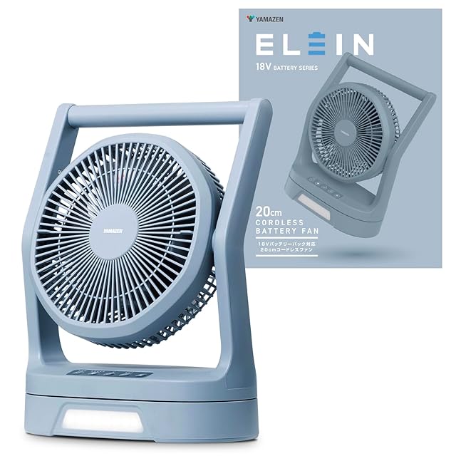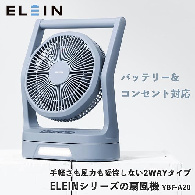 山善 ELEIN 扇風機 コードレス 小型 2WAY電源 (AC/バッテリー) キャンプ アウトドア 左右自動首振り 風量調整5段階 切タイマー LEDライト付き ブルーグレー YBF-A20