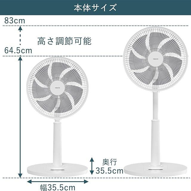 【商品仕様】▪本体サイズ:幅35.5×奥行35.5×高さ64.5~83cm ▪本体重量:2.6kg ▪電源(ACアダプタ):入力=100~240V(50/60Hz) 0.6A(Max)、出力=USB-C(5.0V 3.0A / 9.0V 2.22A / 12.0V 1.67A)合計出力=20.0W Max ▪消費電力(扇風機本体):USB-C 9.0V/12.0V(扇風機本体は入力のみ)、19W ▪付属品:ACアダプタ、USBケーブル、リモコン、取扱説明書 ▪コードの長さ:約1.6m ▪期間:お買い上げ日より1年間(の範囲については、取扱説明書をご確認ください。(一般家庭用以外(業務用など)に使用された場合の故障及び損傷などは対象外となります))