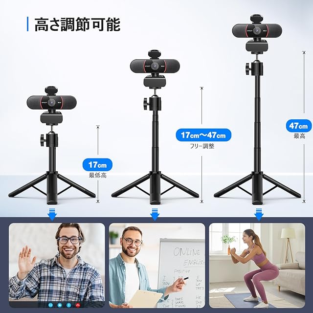 3段階の高さ調節-ウェブカメラの三脚の高さは3段階(14.5/22.5/31.0cm)に調節可能です。14.5cmに調整すると、自分の顔が相手にはっきりと見えるので、テレビ会議での使用に最適です。22.5cmに調整すると、上半身が表示され、グループプレゼンテーションやPPTの説明に適しています。31.0cmに調整すると、全身が写ります。これらの調整可能な高さはさまざまなシナリオに対応し、三脚には滑り止めが付いているため、カメラが滑る心配はありません。