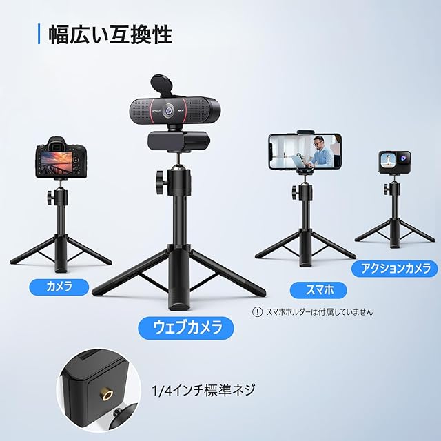 交換性の高い三脚-コンパクトな4Kウェブカメラ三脚は、標準的な1/4インチのネジを使用して、ウェブカメラ、携帯電話、カメラ、アクションカムなど、さまざまなデバイスとシームレスにペアリングできます。高い互換性により、 ビデオ録画、ソーシャルメディアでのライブストリーミング、小規模なイベントにおける素晴らしい瞬間の記録、オンライン会議の安定性とクリアさの確保など、日常のさまざまなニーズに応えます(ご注意:スマホホルダーは付属していません)。