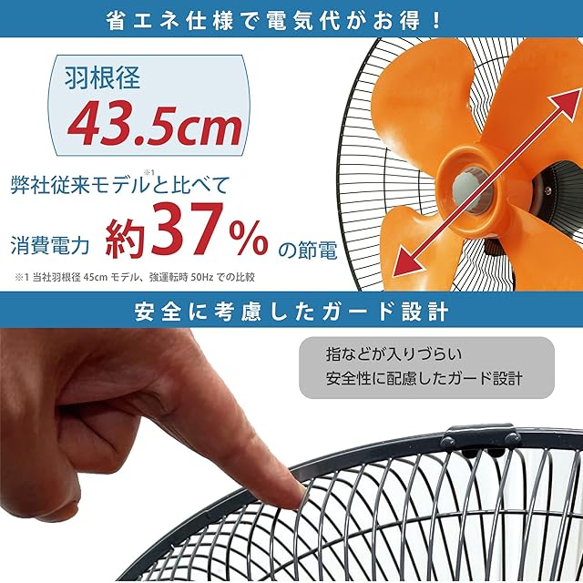 従来タイプ(45cmタイプ)の工業扇と比較して、約37%(50Hz)消費電力量を抑えた省エネ仕様
