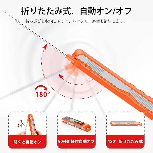 【バックライト付き・折りたたみ式】このデジタル料理温度計は、180°折りたたみ式プローブとバックライト付き大画面を備えており、どんな状況でも見やすくて使いやすいです。折りたたんだ状態から防水プローブを広げるだけで、このインスタント読み取り温度計は自動的にオンになります。また、90秒無操作の場合は自動オフになります。
