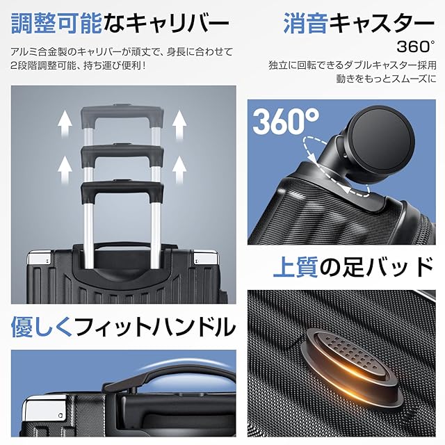 【調整可能キャリバー・隠しフック・USB充電口・TSAロック】ボタン一つでキャリーバーの高さを調節できます。Sは2段階調整、MとLは1段階調整可能のハンドル キャリーバー、耐久性も抜群。隠しフックとUSBポット付きで、スマートフォンやタブレットなどのデバイスを充電することができます、外出先でバッグや小物を掛けるのに便利です!。また、欧米基準のTSAロックも装備され、海外旅行にもピッタリ、より便利な旅行へ。TSAロックを使用し、操作簡単、便利でらくらく。※鍵は航空会社検査専用のため本製品には付属しておりません。