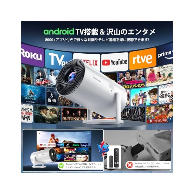 商品名:【最新Android TV搭載&270°回転】OWNKNEW プロジェクター 18000LM 天井投影 1080P WIFI6 自動台形補正 4K対応 Bluetooth5.4 小型 ホームプロジェクター 家庭用 スタンド一体型 内蔵HiFiスピーカー 短距離投影 50%ズーム IOS/Android/パソコン/DVD/PS4/SWITCH等対応 軽量 日本語取扱書 操作簡単 2年