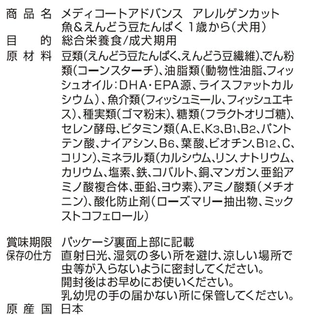商品名:メディコートアレルゲンカット メディコート アドバンス アレルゲンカット 魚&えんどう豆たんぱく 1歳から【国産/アルミ小分け】 2kg(500g×4)