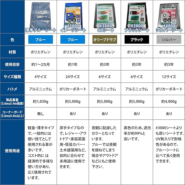 [仕様]#3000厚手、材質:ポリエチレン(本体)、ポリカーボネート(ハトメ)、ハトメ数12ヵ所、ハトメ間隔約90㎝。