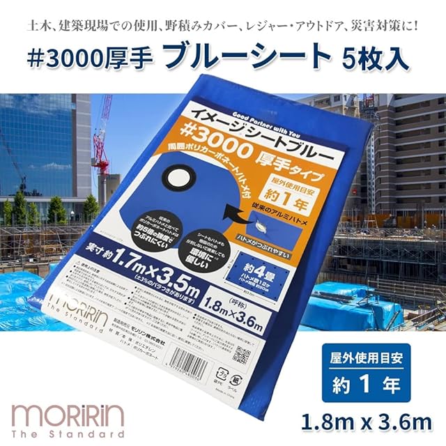 モリリン ブルーシート レジャーシート 5枚セット イメージシートブルー #3000 厚手 1.8×3.6m ポリカーボネートハトメ 使用目安約1年