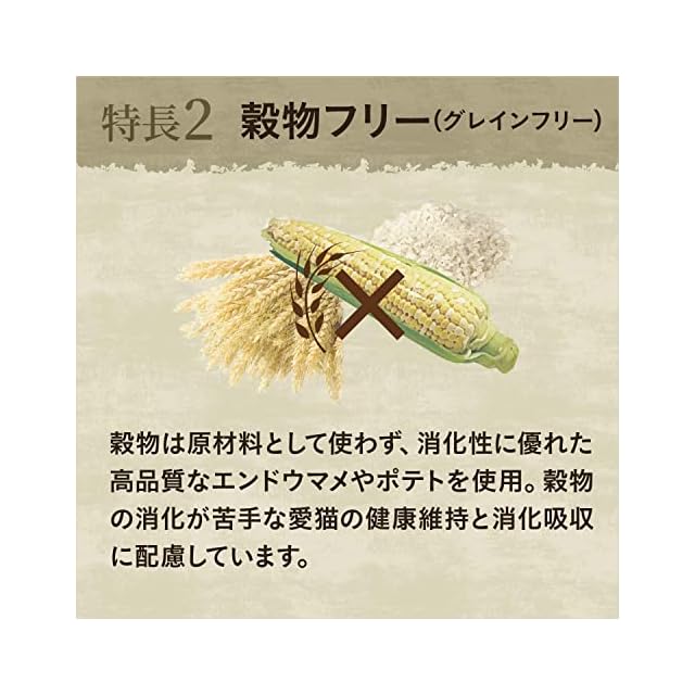 穀物は原材料として使わず、消化性に優れた高品質なエンドウマメやポテトを使用。穀物の消化が苦手な愛猫の健康維持と消化吸収に配慮しています。
