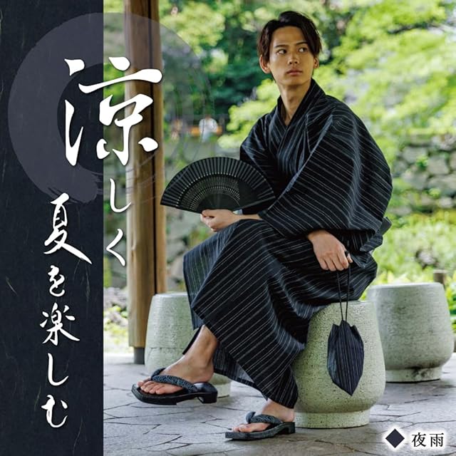 【 商品の仕様について 】メンズ浴衣セット(浴衣・帯・内帯・巾着・扇子・下駄) 浴衣:綿100%、帯:ポリエステル100%、内帯:ポリエステル100%。カラーは黒しじら、紺しじら、濃紺しじら、灰しじら、夜雨の5種類。サイズはS・M・Lサイズをご用意。お好きなカラーと帯で夏をお楽しみください。 夜雨のみ平織となっております。